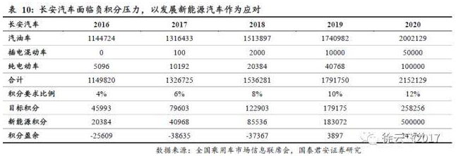 表中汽油車按照15%的增速進(jìn)行預(yù)測。自主品牌領(lǐng)頭羊長安汽車在油耗方面面臨巨大壓力。由于新能源車剛剛起步,規(guī)模尚小,傳統(tǒng)燃料汽車規(guī)模巨大,所以油耗積分和新能源積分都為負(fù)數(shù)。雖然2016年憑借第三階段油耗積分的結(jié)轉(zhuǎn)勉強(qiáng)維持小幅的積分赤字,但是雙積分政策的影響將是持續(xù)的。長安汽車認(rèn)識到問題并積極應(yīng)對,規(guī)劃在2020年實(shí)現(xiàn)15萬輛新能源車。同時(shí)進(jìn)軍油電混動汽車市場,將通過與科力遠(yuǎn)合作推出深混車型、自行研究48V微混技術(shù)等方式降低平均油耗。相比長城,長安的應(yīng)對更具有前瞻性。