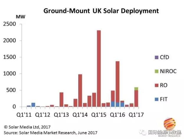 英國(guó)可再生能源義務(wù)證書(RenewableEnergyCertificate)對(duì)地面光伏項(xiàng)目的激勵(lì)政策在2017年3月31日到期,英國(guó)光伏開發(fā)商在2017年第1季度搶裝了640兆瓦爭(zhēng)取補(bǔ)貼的最后一班車。再往后,英國(guó)光伏就主要靠市場(chǎng)競(jìng)爭(zhēng)力來說話了。