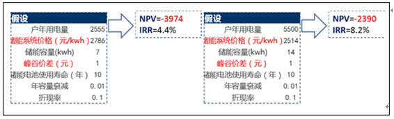 Powerwall已經(jīng)發(fā)布2代產(chǎn)品,一代Powerwall7度電/3000美金,二代產(chǎn)品14度電/5500美金,從戶用經(jīng)濟(jì) 性角度來(lái)看,我們按照光伏板發(fā)電成本0,戶用電成本1元計(jì)算峰谷價(jià)差,以一個(gè)7度電/天乘以365天, 和一個(gè)14度電/天乘以365天的標(biāo)準(zhǔn)住戶為模型測(cè)算,內(nèi)部IRR分別為4.4%和8.2%,凈現(xiàn)值都為負(fù)值。