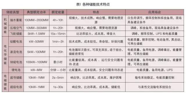 目前,儲能技術路線主要分機械儲能(包括抽水蓄能、壓縮空氣儲能、飛輪儲能等)、電化學儲能(包括鉛酸電池、鋰離子電池、液流電池、鈉硫電池等)和電磁儲能(包括超導儲能、超級電容器儲能等)等幾種,各種技術的特點如下表所示。