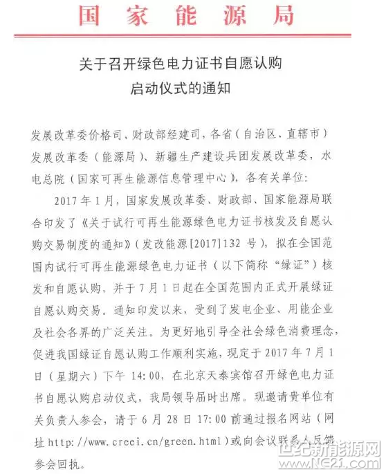 2017年7月1日,國家能源局即將召開綠色電力證書自愿認(rèn)購啟動儀式: