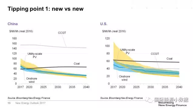第一個臨界點是:在沒有補貼的情況下,新建風電、光伏電站發(fā)電成本可與新建煤電、天然氣電站競爭。在目前的市場條件下,在很多國家已經(jīng)接近這一臨界點。在德國,新建陸上風電的發(fā)電成本已經(jīng)低于煤電、天然氣發(fā)電;在中國,目前煤電成本在各類電源中依然是最低的,但是預期2019年陸上風電成本將低于煤電、2021年光伏成本也將低于煤電;在美國,天然氣發(fā)電是各類電源中成本最低的,但預計2022-2023年風電、光伏成本均將低于天然氣發(fā)電;在印度,預計2020年起新建光伏將在全國范圍內(nèi)低于煤電。