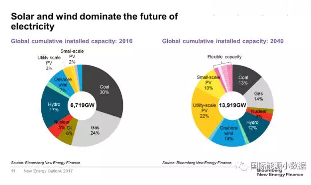 根據(jù)BNEF的預測,2040年太陽能光伏將成為主導能源之一,占全球發(fā)電總裝機的32%;風電14%、水電12%、煤電14%、天然氣13%、核電3%。