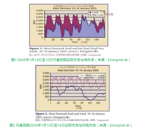 單個(gè)或多個(gè)風(fēng)電場(chǎng)的發(fā)電量是隨時(shí)間而變化的。風(fēng)電的變動(dòng)性加之電力系統(tǒng)原本就存在的變動(dòng)性,可能會(huì)增加變動(dòng)的復(fù)雜性,需要電網(wǎng)運(yùn)營(yíng)商進(jìn)行管理和調(diào)控。風(fēng)能每發(fā)1度電,其他發(fā)電形式就可以少發(fā)1度電,所以其他的發(fā)電系統(tǒng)只需要滿足除風(fēng)電之外的負(fù)荷需求,這部分負(fù)荷經(jīng)常被稱作凈負(fù)荷(除風(fēng)電外負(fù)荷)。因此,整個(gè)電力系統(tǒng)的非風(fēng)力發(fā)電部分就要被調(diào)控至凈負(fù)荷,即整個(gè)電力系統(tǒng)負(fù)荷與風(fēng)電負(fù)荷之差。圖1顯示了丹麥西部地區(qū)一周內(nèi)的實(shí)際負(fù)荷與凈負(fù)荷,兩條曲線之間部分就是風(fēng)電部分。圖2更清晰地表示了實(shí)際負(fù)荷與風(fēng)電負(fù)荷之間的對(duì)比。