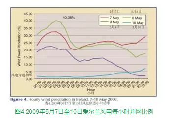 一些國(guó)家的電網(wǎng)運(yùn)營(yíng)商在積累高比例風(fēng)電并網(wǎng)及其變化規(guī)律的運(yùn)營(yíng)經(jīng)驗(yàn)。圖4顯示了從2009年5月7日至10日,愛(ài)爾蘭風(fēng)電的每小時(shí)接入比例,范圍從很小的比例到高達(dá)40%。同樣,圖1(如上所述)顯示了2005年1月丹麥的實(shí)際負(fù)荷與凈負(fù)荷(減去風(fēng)電后的負(fù)荷)。該圖顯示風(fēng)力發(fā)電量逐漸增加,而后由高風(fēng)速導(dǎo)致停機(jī)使發(fā)電量減少。更高的風(fēng)力發(fā)電量使得凈負(fù)荷在某些時(shí)段接近于零。正如本文后面討論的,電網(wǎng)運(yùn)營(yíng)商通過(guò)使用現(xiàn)有的靈活發(fā)電資源、風(fēng)力預(yù)測(cè)以及時(shí)間調(diào)度等手段,來(lái)應(yīng)對(duì)風(fēng)力的變化。在以更接近于實(shí)時(shí)的情況下進(jìn)行評(píng)估時(shí),發(fā)電量更具可預(yù)測(cè)性,而小于小時(shí)單位的調(diào)度方案也使電網(wǎng)運(yùn)營(yíng)方可以充分利用其他發(fā)電設(shè)備的靈活性。此外,更大范圍內(nèi)(或電網(wǎng)覆蓋區(qū)域)的電力平衡有助于解決風(fēng)電的變化,因?yàn)樵谳^大的地理區(qū)域內(nèi)風(fēng)電的波動(dòng)性會(huì)趨于平緩。