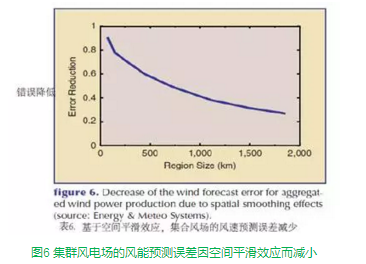 如圖所示,750公里以上范圍的風(fēng)電集群預(yù)測(cè)誤差降低了50%。圖中顯示了誤差率已經(jīng)降至區(qū)域預(yù)測(cè)和單一風(fēng)電場(chǎng)的標(biāo)準(zhǔn)誤差(RMSE)之間,以上數(shù)據(jù)是基于對(duì)德國(guó)40個(gè)風(fēng)電場(chǎng)所發(fā)電量的測(cè)量結(jié)果得到的。德國(guó)的一些其他研究顯示,對(duì)于一個(gè)獨(dú)立風(fēng)電場(chǎng)的典型風(fēng)能預(yù)測(cè)誤差約為該風(fēng)電場(chǎng)裝機(jī)容量的10%~15%標(biāo)準(zhǔn)誤差(RMSE),而對(duì)未來(lái)一天某一區(qū)域的誤差率降至6%~8%,對(duì)于整個(gè)德國(guó)的風(fēng)能預(yù)測(cè)誤差降至5%~7%。如標(biāo)準(zhǔn)誤差(RMSE)法所測(cè)算的那樣,綜合應(yīng)用不同的風(fēng)能預(yù)測(cè)模型,也能提高最多20%的風(fēng)能預(yù)測(cè)精度。