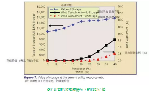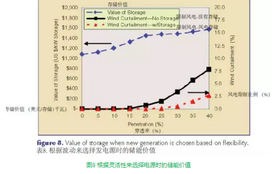 圖7是近似于美國(guó)西部電網(wǎng)調(diào)度的一個(gè)簡(jiǎn)單例子,圖中所有數(shù)值僅供參考,假定一個(gè)為高峰負(fù)荷的10%、具有168小時(shí)的儲(chǔ)能能力的儲(chǔ)能設(shè)備,然后進(jìn)行儲(chǔ)能分析。系統(tǒng)大量接納風(fēng)電的能力主要取決于其他多種電源的構(gòu)成情況。儲(chǔ)能是一種靈活的電源形式,即使系統(tǒng)中沒(méi)有風(fēng)電,儲(chǔ)能本身對(duì)電網(wǎng)系統(tǒng)來(lái)說(shuō)也是具有經(jīng)濟(jì)價(jià)值的。隨著風(fēng)電并網(wǎng)量的增加,儲(chǔ)能系統(tǒng)的價(jià)值也相應(yīng)提升。沒(méi)有風(fēng)電的情況下,儲(chǔ)能的價(jià)值在每千瓦超過(guò)1000美元,可見(jiàn),低成本的儲(chǔ)能設(shè)備為系統(tǒng)提供了可觀的經(jīng)濟(jì)價(jià)值。隨著風(fēng)電接入比例的提高,儲(chǔ)電系統(tǒng)的價(jià)值也會(huì)增加,最終能達(dá)到每千瓦1600美元左右。目前美國(guó)很多地區(qū)的電源結(jié)構(gòu)與這個(gè)例子中的情況很接近。在風(fēng)電占比很高的系統(tǒng)中,儲(chǔ)能具有更大價(jià)值,因?yàn)檎{(diào)度起來(lái)更經(jīng)濟(jì),從而使可變成本較低的發(fā)電機(jī)組(諸如火電和核電)的利潤(rùn)空間受到壓縮(及產(chǎn)生市場(chǎng)出清價(jià)格)。更多的低電價(jià)時(shí)段拉大了價(jià)差,增加了套利的機(jī)會(huì),提升了儲(chǔ)能的價(jià)值。