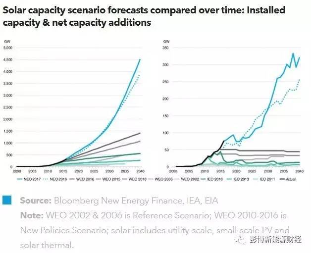 2017年彭博新能源財(cái)經(jīng)新能源市場(chǎng)長(zhǎng)期展望預(yù)測(cè),光伏和光熱的總裝機(jī)將達(dá)4,506GW,而IEA報(bào)告則僅在“新政策情景”下,給出了1481GW的預(yù)測(cè)值。