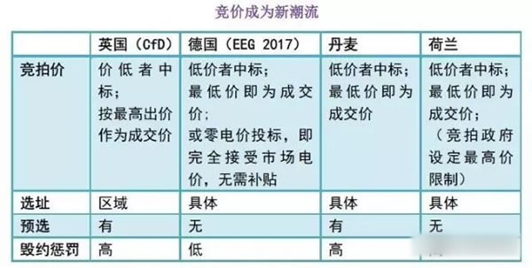 競(jìng)拍規(guī)則各國(guó)有所不同,歐洲各國(guó)均采取度電價(jià)格投標(biāo),以價(jià)低者中標(biāo),但最后出清價(jià)格各異,其中英國(guó)以競(jìng)拍最高價(jià)出清,而大多數(shù)國(guó)家采用中標(biāo)價(jià)出清。而中國(guó)的特許經(jīng)營(yíng)權(quán)綜合考量多方因素,價(jià)格只是其中一個(gè)要素。美國(guó)則采用商業(yè)租賃的形式,拍賣土地,價(jià)高者獲得。