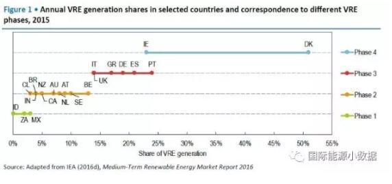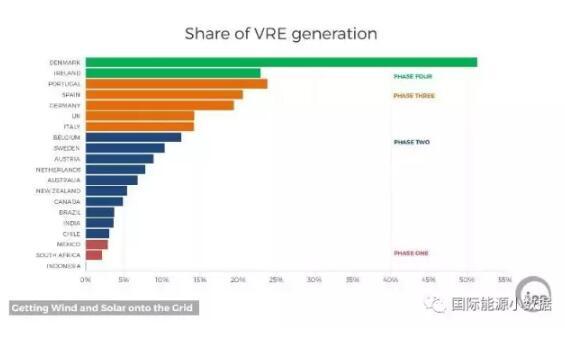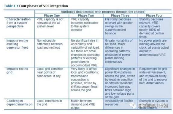 中國儲能網(wǎng)訊:國際能源署發(fā)布報告Getting Wind and Sun onto the Grid,按照電網(wǎng)吸納間歇性可再生能源(主要是風電、光伏)的比例劃分了4個階段: