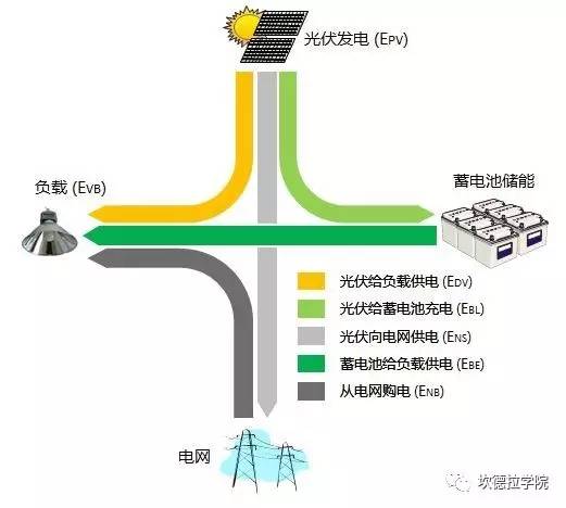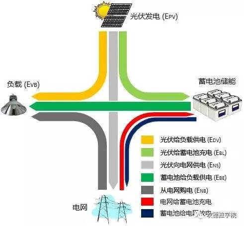 中國儲能網(wǎng)訊:光伏儲能系統(tǒng)能量管理的目標(biāo)是:能量資源與負荷需求的精確匹配。由于集合了不同的技術(shù),重要的是采取正確的策略實現(xiàn)性能的最大化以及成本最小化。下圖是光伏儲能系統(tǒng)能量流動的關(guān)系圖。