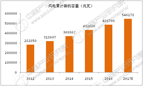 2012-2017年全球風(fēng)電累計(jì)裝機(jī)容量