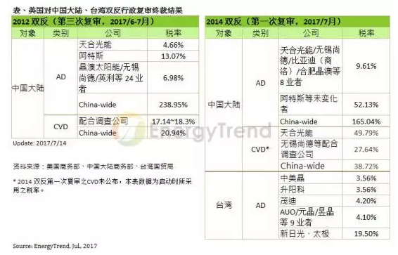 美國對兩岸的光伏雙反調(diào)查共分為五個案號,分別為2012年對中國大陸的反傾銷與反補(bǔ)貼、2014年對中國大陸的反傾銷與反補(bǔ)貼、以及2014年對臺灣的反傾銷,并且分別在不同的行政復(fù)審階段。目前根據(jù)中、臺、美三方官方單位所發(fā)布的消息,已經(jīng)確定終裁的行政復(fù)審結(jié)果如下: