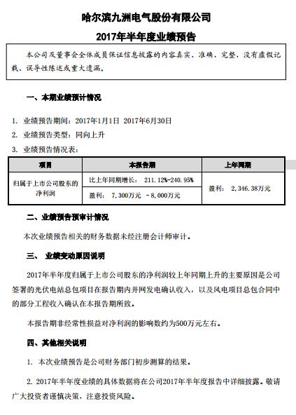 中國(guó)儲(chǔ)能網(wǎng)訊:北極星風(fēng)力發(fā)電網(wǎng)獲悉,九洲電氣近日發(fā)布預(yù)告稱(chēng)2017年上半年預(yù)計(jì)盈利7300-8000 萬(wàn)元,主要原因是公司簽署的光伏電站總包項(xiàng)目在報(bào)告期內(nèi)并網(wǎng)發(fā)電確認(rèn)收入,以及風(fēng)電項(xiàng)目總包合同中的部分工程收入確認(rèn)在本報(bào)告期所致。以下為預(yù)告原文:
