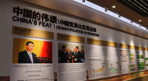 沙漠生態(tài)科技中心(展示中心)通過多媒體和圖文展板等形式,全面、立體地展示了世界荒漠化防治形勢,中國荒漠化防治成果以及內蒙古、鄂爾多斯治沙生態(tài)科技成果;展示了庫布其的歷史變遷,在庫布其生態(tài)治沙扶貧的卓越成就,包括種質資源、治沙技術、種植技術、節(jié)水技術、生態(tài)修復技術等核心技術以及核心專利發(fā)明、治沙扶貧等內容。