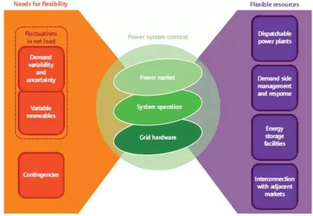 IEA將風(fēng)電和光伏統(tǒng)稱為VariableRenewableEnergy,即VRE。作為風(fēng)電和光伏的統(tǒng)稱,VRE很好的概括并體現(xiàn)了風(fēng)電和光伏發(fā)電的特點。而解決VRE的消納問題,關(guān)鍵則在于電力系統(tǒng)柔性是否充足。柔性一詞在歐美國家較為常用,根據(jù)IEA的定義,柔性(Flexibility)是描述一個電力系統(tǒng)應(yīng)對可預(yù)期的或者不可預(yù)期的變化的能力,以此保證發(fā)電和用電的平衡。也就是說柔性是描述一個電力系統(tǒng)應(yīng)對突發(fā)“不平衡事件”的能力,體現(xiàn)為單位時間內(nèi)向上或向下輸出一定功率的能力。當(dāng)電力系統(tǒng)出現(xiàn)負(fù)荷波動或不確定性,以及發(fā)電機組突然停機脫網(wǎng)等特殊情況時,電力系統(tǒng)都需要通過柔性源加以應(yīng)對。隨著可再生能源發(fā)電規(guī)模的增加,電力系統(tǒng)的柔性能力顯得愈發(fā)重要。為什么提供柔性能力的是柔性源而不是發(fā)電機組呢?因為柔性源不只是發(fā)電機組,還包括現(xiàn)貨市場(通過電價信號引導(dǎo)負(fù)荷)、需求響應(yīng)(demandresponse)、儲能和區(qū)域間聯(lián)絡(luò)線(跨區(qū)或者跨國電力交易)等多種方式,如下圖所示。