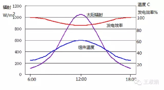 對(duì)系統(tǒng)效率影響最大的自然因素應(yīng)該是溫度。溫度系數(shù)是光伏組件非常重要的一個(gè)參數(shù)。一般情況下,晶硅電池的溫度系數(shù)一般是 -0.35~-0.45%/℃,非晶硅電池的溫度系數(shù)一般是-0.2%/℃左右。而光伏組件的溫度并不等于環(huán)境溫度。下圖就是光伏組件輸出功率隨組件溫度的變化情況。