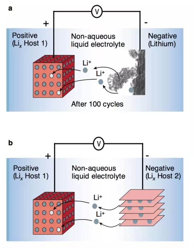 △ 圖2:鋰電池的工作原理圖:a. 鋰金屬電池;b. 鋰離子電池。層狀結(jié)構(gòu)可以有序的存儲(chǔ)鋰離子,防止枝晶的形成。(圖片來(lái)源:[7])