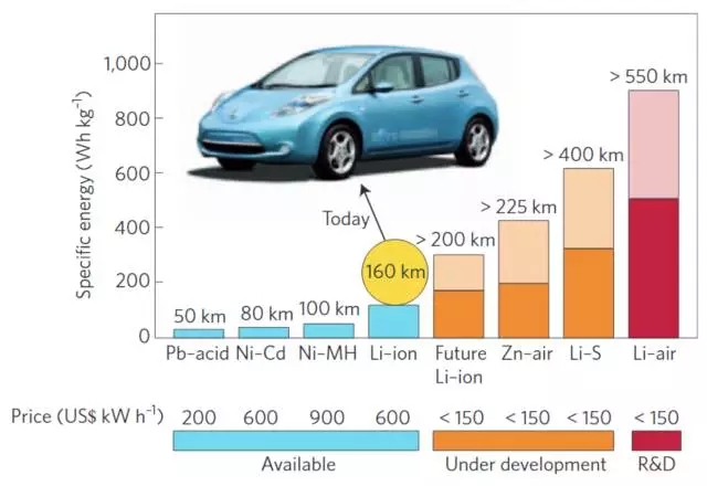 然而方法總比問(wèn)題多,為了進(jìn)一步提高可充電池的能量密度,減輕電池重量就成了一個(gè)突破口。雖然暫時(shí)無(wú)法找到比金屬鋰具有更高能量質(zhì)量比的材料,但我們可以給電池整體來(lái)一個(gè)減重瘦身,進(jìn)而提高電池整體的能量密度。其中最具代表性的就是鋰-空氣電池了。鋰-空氣電池的理論計(jì)算能量密度可以達(dá)到12000Wh/Kg,這足以媲美汽油的超高能量密度,使其有望完全替代汽油,真正實(shí)現(xiàn)超長(zhǎng)旅程的純電動(dòng)汽車(chē)[9, 10](圖3)。