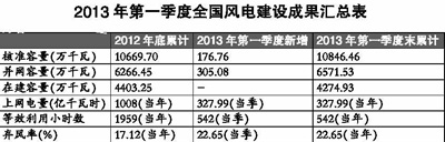 2013年第一季度,全國風(fēng)電累計核準(zhǔn)容量10846萬千瓦。其中,并網(wǎng)容量為6571萬千瓦,在建容量為4275萬千瓦,風(fēng)電并網(wǎng)容量占核準(zhǔn)比例為61%。2003年第一季度,全國風(fēng)電新增核準(zhǔn)容量177萬千瓦,新增并網(wǎng)容量305萬千瓦。第一季度全國風(fēng)電上網(wǎng)電量為328億千瓦時,平均等效滿負(fù)荷利用小時數(shù)為542小時。(見上表)