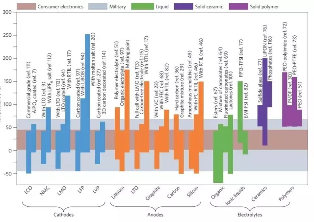 有鑒于此,RiceUniversity的Pulickel M. Ajayan等人從鋰離子電池的材料角度闡述了近年來(lái)極端溫度條件下(<20℃或>60℃)的鋰離子電池的研究進(jìn)展。