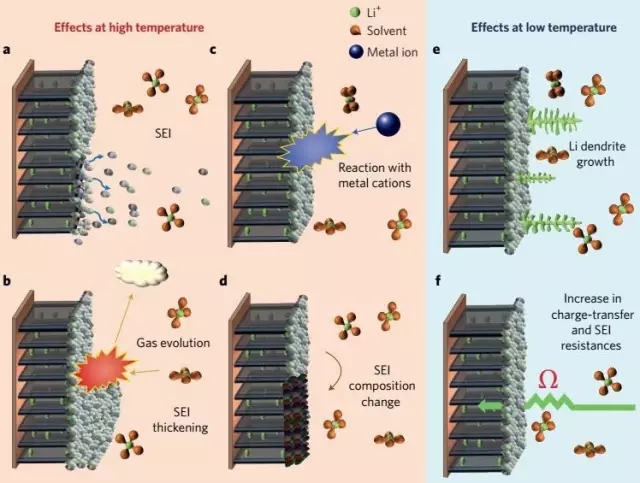 低溫條件下,電解質(zhì)粘度增加,阻礙離子遷移和電極潤(rùn)濕性,降低比率性能;而且,導(dǎo)電性降低將引起電極周圍鋰離子的消耗。高溫條件下,電解質(zhì)容易發(fā)生化學(xué)變化,并和帶電的電極發(fā)生反應(yīng)。