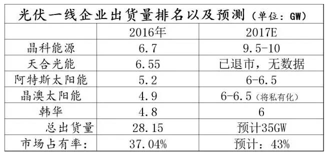 前五大光伏組件產業(yè)去年總出貨量28.15GW,占去年總銷售量的37.04%,今年前五大企業(yè)預計出貨量會達到35GW,市場占有率會進一步提升至43%,其中晶科能源增長最為迅速(負債率也相對偏高),預計2017年將會穩(wěn)固光伏一哥的位置。這其中天合光能已經于去年退市,晶澳太陽能也提出了私有化邀約(6.8$)且這個私有化邀約沒比當前股價(6.5$)高多少,除非撤銷要約或者邀約不通過,不然晶澳太陽能上漲空間有限。剩下的幾大巨頭表現(xiàn)都非常好,而且即便經過這一輪暴漲,大部分公司股價依舊在凈資產一下,算是價值發(fā)現(xiàn)的一輪行情。