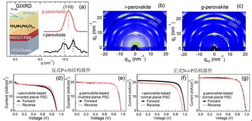 圖(a)略入射XRD測量示意圖,以及有機(jī)-無機(jī)雜化鈣鈦礦薄膜的略入射XRD譜(X光入射角度0.2度)。(b)CH3NH3PbI3-xClx薄膜二維GI-XRD譜;(c)優(yōu)化薄膜后處理條件后測量的二維GI-XRD譜?;?d) r-和(e) g-鈣鈦礦薄膜的反式P-i-N結(jié)構(gòu)器件J-V曲線。(f)和(g)為正式N-i-P結(jié)構(gòu)器件J-V曲線。