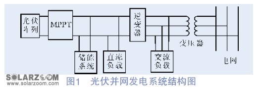 如圖1所示,光伏并網(wǎng)發(fā)電系統(tǒng)的典型結(jié)構(gòu)應(yīng)該包含5部分:光伏陣列、最大功率點(diǎn)跟蹤(MPPT)裝置、儲(chǔ)能系統(tǒng)、并網(wǎng)逆變器以及并網(wǎng)變壓器。