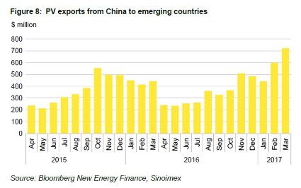 中國儲能網(wǎng)訊:彭博新能源財(cái)經(jīng)表示,3月份,非經(jīng)合組織國家采購的中國光伏產(chǎn)品達(dá)7.22億美元,是2015年1月以來的月度最高。
