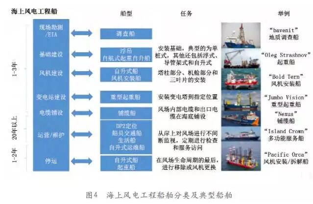 隨著項(xiàng)目的增加和技術(shù)難度的提升,海上風(fēng)電工程裝備需求大增,具體包括:起重船/平臺(tái)、風(fēng)機(jī)運(yùn)輸船、風(fēng)電安裝船/平臺(tái)、風(fēng)電運(yùn)維船、鋪纜船、供應(yīng)船、調(diào)查船等一系列工程船。其中,起重船、風(fēng)機(jī)運(yùn)輸船、鋪纜船、調(diào)查船等與其他海工船的功能并無(wú)明顯差別,在對(duì)原有工程船進(jìn)行適當(dāng)改裝后可實(shí)現(xiàn)通用。