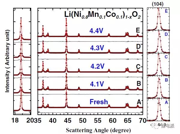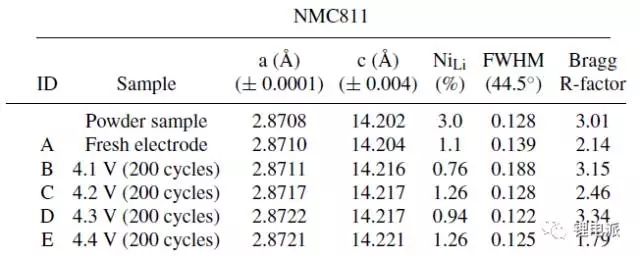 1.未循環(huán)的極片晶格常數(shù)和NCM811活物質(zhì)粉末的晶格常數(shù)是一致的。循環(huán)截止電壓是4.1V時(shí),其晶格常數(shù)也與前兩者無明顯區(qū)別,c軸有少量增加。再看循環(huán)截止電壓為4.2V、4.3V、4.4V的c軸晶格常數(shù),與4.1V的無明顯區(qū)別(差異為0.004埃),而在a軸上的數(shù)據(jù)就差異比較大了。