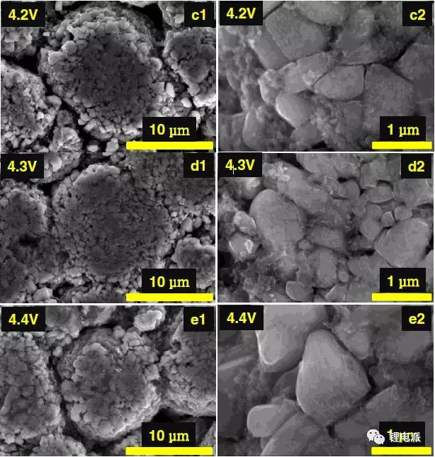 a1 a2為未經(jīng)過循環(huán)的電池SEM圖片。b~e分別為在0.5C條件下、充電截止電壓為4.1V/4.2V/4.3V/4.4V,循環(huán)200cycle后正極活物質(zhì)的SEM圖像,其中左側(cè)為低倍率下,右側(cè)為高倍率下電鏡圖片。由上圖可以看出,循環(huán)后的電池與未循環(huán)的電池在顆粒形貌、破碎程度上并沒有特別大的區(qū)別。