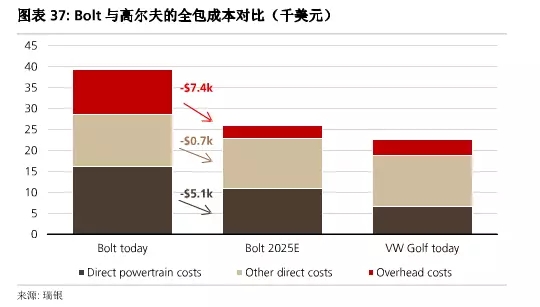 根據(jù)瑞銀的分析,“裸版”Bolt的總直接生產(chǎn)成本為2.87萬美元(見下)。這意味著每銷售一輛車,將會(huì)帶來3200美元的正邊際收益(其定義為售價(jià)減去現(xiàn)金生產(chǎn)成本)。邊際收益為售價(jià)(不含經(jīng)銷商的加價(jià)部分)的10%。因此,通用有動(dòng)力提高銷量。不過在EBIT層面(考慮相應(yīng)的管理費(fèi)用和折舊/攤銷費(fèi)用后),每銷售一輛車,通用很可能虧損7400美元。
