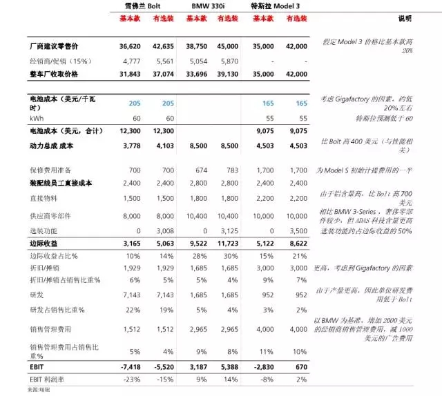 特斯拉品牌更為高端(定價(jià)能力強(qiáng)、更多提高盈利的選裝選項(xiàng))、電池化學(xué)原理不同、電池生產(chǎn)規(guī)模更大(Gigafactory)、后輪驅(qū)動(dòng)而非前輪驅(qū)動(dòng)(后期會(huì)推出全驅(qū)款)、更多的互聯(lián)網(wǎng)功能(如無線升級(jí))、自動(dòng)駕駛相關(guān)硬件為標(biāo)配(攝像頭、傳感器)、生產(chǎn)目標(biāo)更高(比Bolt高10倍以上)因此或能更好地吸收固定成本。