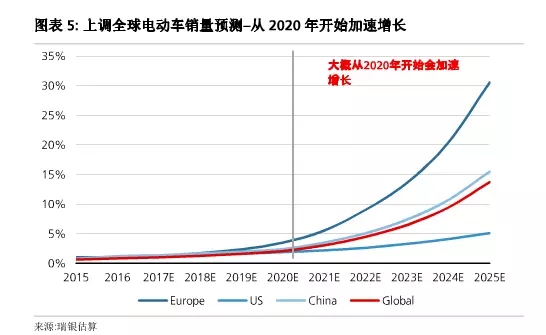 最新預(yù)測(cè)與瑞銀之前預(yù)測(cè)的差異主要來自于歐洲,瑞銀現(xiàn)在預(yù)計(jì)2025年歐洲電動(dòng)車銷量占比為30%。雖然乍一看調(diào)整后的銷量預(yù)測(cè)較為激進(jìn),但與瑞銀從相關(guān)消費(fèi)者調(diào)查中得到的結(jié)論是一致的(UBS Evidence Lab survey ),也不有悖于電池原材料供給缺口和所需的電力基礎(chǔ)設(shè)施投資。