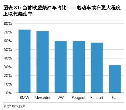 電動(dòng)車加速增長(zhǎng)的不利一面則是燃油車的價(jià)值快速降低,而整車廠也沒有太多時(shí)間來:1)調(diào)整生產(chǎn)能力和人員;2)通過其金融公司管理殘值風(fēng)險(xiǎn)。歐洲整車廠面臨的風(fēng)險(xiǎn)最大,尤其是考慮到電動(dòng)車很可能造成柴油車的退出。