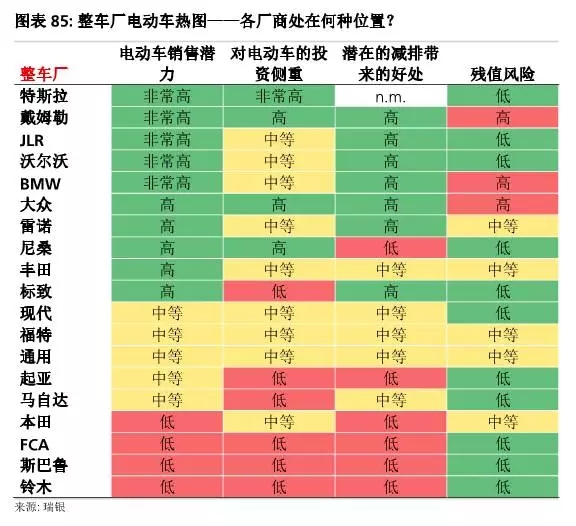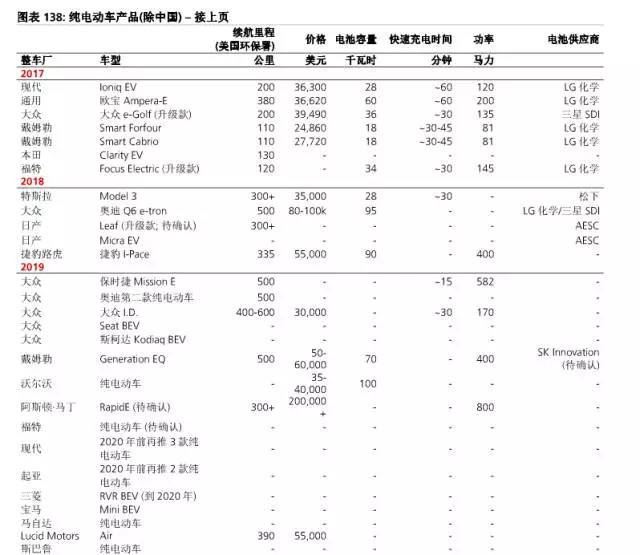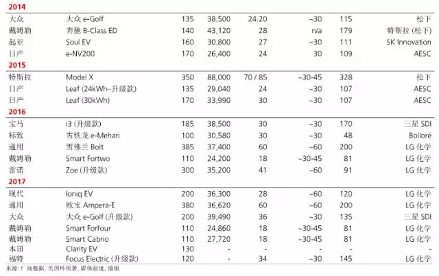 美國:對(duì)于專注于美國市場(chǎng)且高端產(chǎn)品占比低的整車廠(福特、通用和FCA),短期內(nèi)電動(dòng)車對(duì)其影響較小。通用顯然是電動(dòng)車開發(fā)的領(lǐng)先者——自2010年雪佛蘭Volt(插電式混合動(dòng)力車)問世以來,公司已有7年的開發(fā)經(jīng)驗(yàn)。通用的Bolt則是首個(gè)續(xù)航里程在200英里以上、面向大眾市場(chǎng)的純電動(dòng)車。不過,由于銷量有限,Bolt對(duì)通用的整體盈利不會(huì)有太大影響。長(zhǎng)期來看,隨著歐寶在歐洲的銷售,通用正在離開潛在增速最快的電動(dòng)車領(lǐng)域。福特在電動(dòng)車領(lǐng)域經(jīng)驗(yàn)有限——2012年推出C-Max和Focus電動(dòng)車,2013年推出Fusion混合動(dòng)力車;不過,福特正在迎頭趕上——未來5年公司將會(huì)投資45億美元在13款電動(dòng)車上(包括混合動(dòng)力車/插電式混合動(dòng)力車/純電動(dòng)車)。FCA在電動(dòng)車開發(fā)方面落后于通用和福特??紤]到即將推出的Model 3的預(yù)測(cè)盈利能力和銷量水平,特斯拉仍然顯得過貴。此外,瑞銀認(rèn)為未來幾年隨著豪車廠商開始推出電動(dòng)車產(chǎn)品,競(jìng)爭(zhēng)將會(huì)日趨激烈。