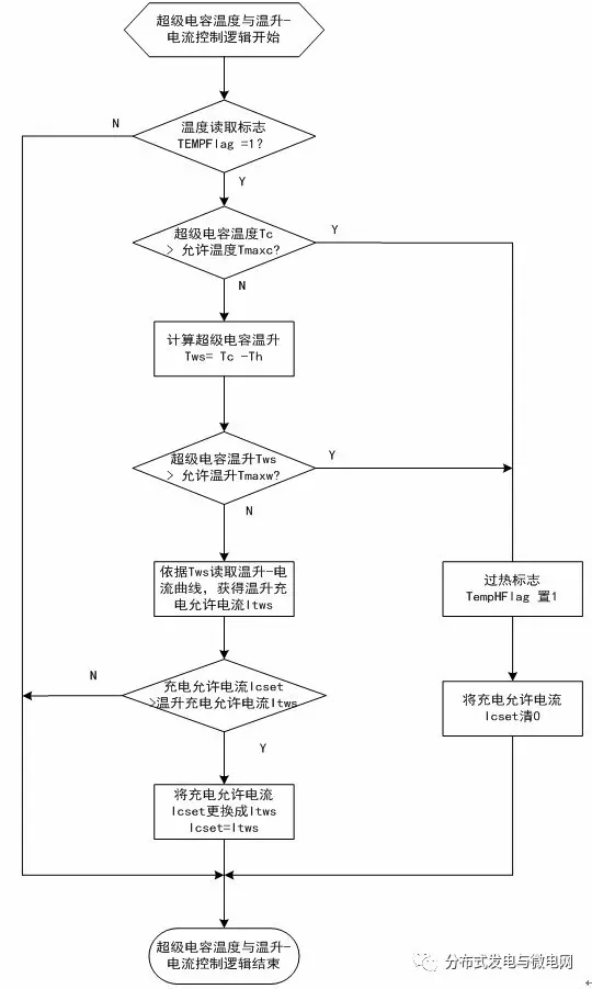 3)充電過程兼顧超級電容的溫度特性,采用超級電容溫升-電流曲線進行限制充電,同時監(jiān)視超級電容溫升過高和絕對溫度過高并停止充電,避免繼續(xù)充電導(dǎo)致溫度極限升高造成超級電容壽命快速減小或發(fā)生爆炸。