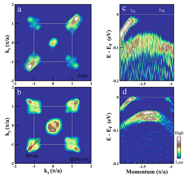 圖4.單層FeSe/SrTiO3薄膜N相的費米面(a)與能帶結(jié)構(gòu)(c) 和鐵基超導(dǎo)體母體BaFe2As2處于反鐵磁態(tài)時的費米面(b)與能帶結(jié)構(gòu)(d)的比較。