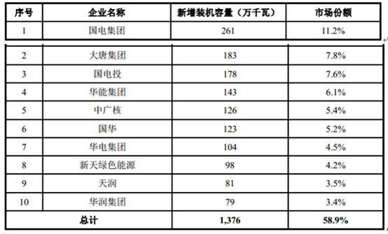 2016 年我國(guó)風(fēng)電新增裝機(jī)排名前 10 的開發(fā)商及市場(chǎng)份額情況如下: