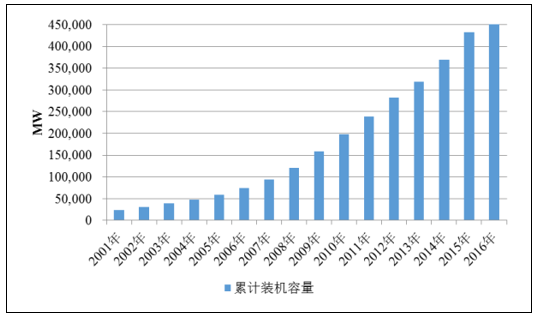 2001-2016年全球風(fēng)電裝機(jī)累計(jì)容量