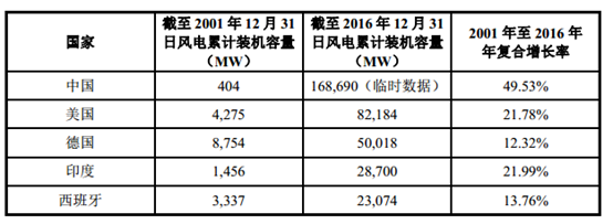 按照 2016 年底的風(fēng)電累計(jì)裝機(jī)容量計(jì)算, 全球前五大風(fēng)電市場(chǎng)依次為中國(guó)、美國(guó)、德國(guó)、印度和西班牙,在 2001 年至 2016 年間,上述 5 個(gè)國(guó)家風(fēng)電累計(jì)裝機(jī)容量年均復(fù)合增長(zhǎng)率如下表所示: