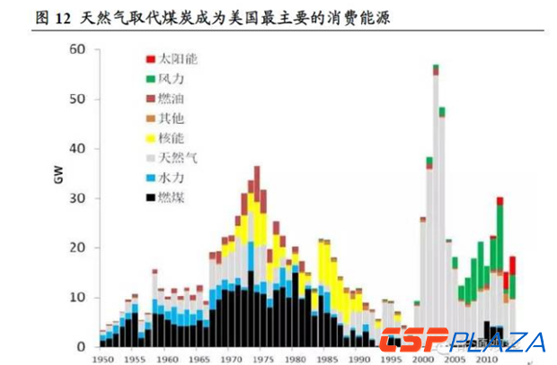 美國能源結(jié)構(gòu)主導者由煤炭變?yōu)樘烊粴?。美國擁有世界上最大的煤炭儲量,是世界第二大煤炭生產(chǎn)國,回顧美國能源發(fā)展歷史,直到20世紀80年代煤炭裝機量占比維持在較高的水平。自2000年以來,隨著美國頁巖氣革命的成功和向全世界蔓延,天然氣逐漸在美國能源結(jié)構(gòu)中占據(jù)絕對主導地位。