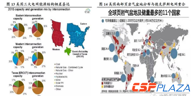 中國儲能網(wǎng)訊:能源結(jié)構(gòu)決定中美電網(wǎng)差異化形態(tài)。①東部電網(wǎng)地區(qū)因靠近美國主要煤、氣供應地而以煤炭和天然氣發(fā)電為主。②西部電網(wǎng)地區(qū)則因靠近科羅拉多山系和河流,分布有落基山脈等地勢落差很大的山體,主要以水電裝機為主。山脈地形客觀上也阻礙了西部電網(wǎng)對外聯(lián)結(jié)的發(fā)展。③南部的德克薩斯電網(wǎng)處于頁巖氣盆地所在地,天然氣發(fā)電一家獨大,形成了區(qū)域內(nèi)的獨立小電網(wǎng)。