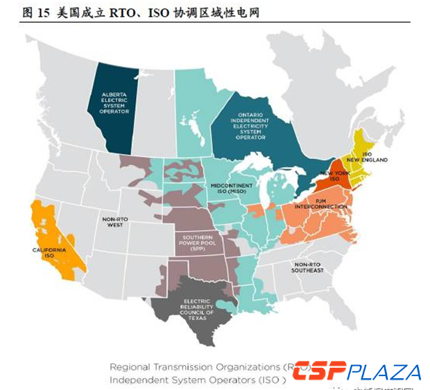 美國電網(wǎng)建設之初便是分散破碎的。①美國作為世界上最先廣泛使用電力的國家,在資本主義私有制的經(jīng)濟體制下,其電力產(chǎn)業(yè)在自由市場中從無到有逐漸發(fā)展起來?;谶@樣的歷史背景,美國的電力產(chǎn)業(yè)結(jié)構(gòu)非常復雜,尤其是電網(wǎng)的產(chǎn)權(quán)結(jié)構(gòu)支離破碎,分散掌握在超過五百家的公司與組織手中。再加上電力產(chǎn)業(yè)的自然壟斷性質(zhì),每一家電力公司都是當?shù)氐男袠I(yè)壟斷者。②而美國憲法高度重視對私有財產(chǎn)權(quán)的保護,不能隨意干涉電力公司的經(jīng)營,因此只能協(xié)商、呼吁鄰近區(qū)域的電力公司聯(lián)合成立電網(wǎng)調(diào)度組織RTO(Regional Transmission Organization)或者ISO(Independent System Operator)。