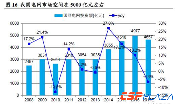我國電網(wǎng)投資市場空間在5000億元左右。國家電網(wǎng)投資額從2008年2500億元增長至2016年近5000億元,8年時間投資額增長一倍,年均復合增速達到9%,近年國家電網(wǎng)投資額保持在4500億元以上,投資額增速逐年下降,市場空間保持在5000億元左右。2017年投資額增速預估為-6.4%,相較于2016年10.2%的增速下降趨勢十分明顯。