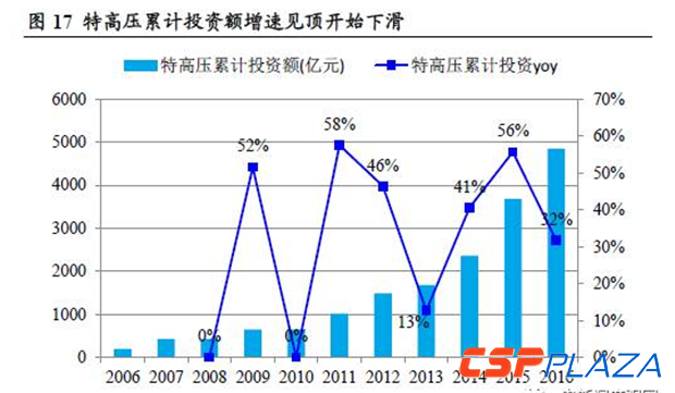 特高壓投資額增速陷入瓶頸期。特高壓累計投資額在2012年之前年均復合增速在20%左右,2014年開始進入快速增長,2015年增速超過50%,增速接近天花板,2016年特高壓累計投資額增速同比下降超過20個百分點,這一趨勢受我國電網(wǎng)投資額整體減速影響較大。