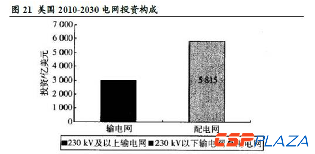2010-2030年的20年間,在電網(wǎng)建設投資中,配電網(wǎng)投資將達到5815億美元,接近輸電網(wǎng)投資額的兩倍,整體上看電網(wǎng)年均投資額為440億美元。