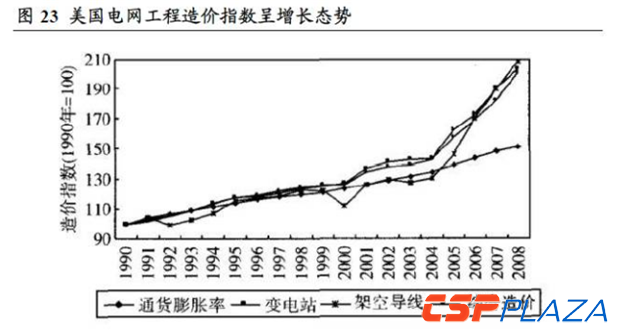 美國電網(wǎng)建設成本呈現(xiàn)上漲態(tài)勢。①電源結(jié)構(gòu)變化提出長距離輸電線路建設需求:可再生能源如風電、地熱發(fā)電裝機增長較快,出于環(huán)保和燃料供應的考慮,這些電廠一般都遠離負荷中心,需要新建長距離輸電線路,直接推動了輸電網(wǎng)投資的上升。②電網(wǎng)項目建設成本上漲。原材料、土地、人工成本的上升都給電網(wǎng)項目建設造成很大的成本壓力。
